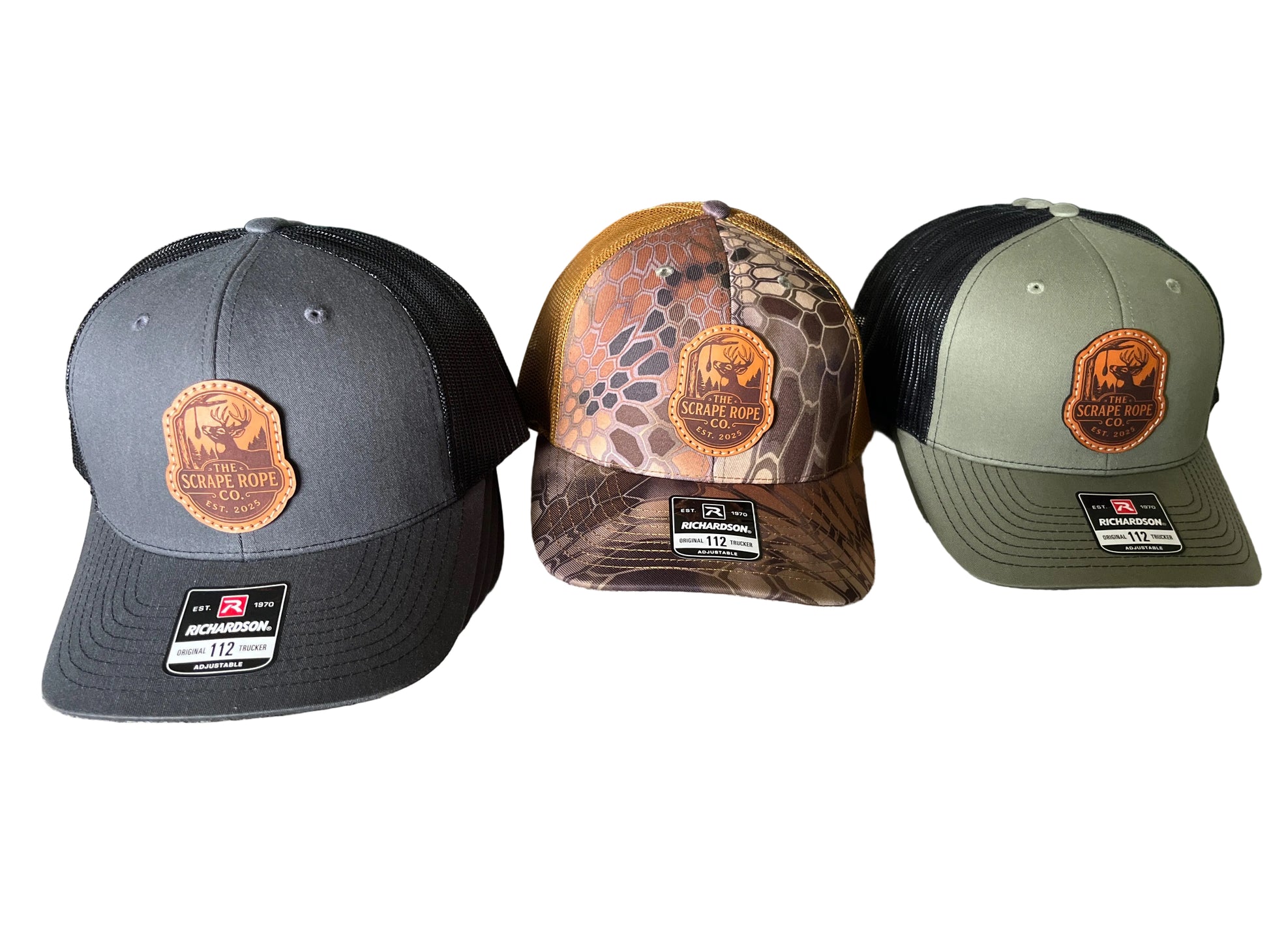 These are Richardson 112 trucker hats with a sewn on Scrape Rope Co patch. These are a SnapBack adjustable hat. One size fits most.